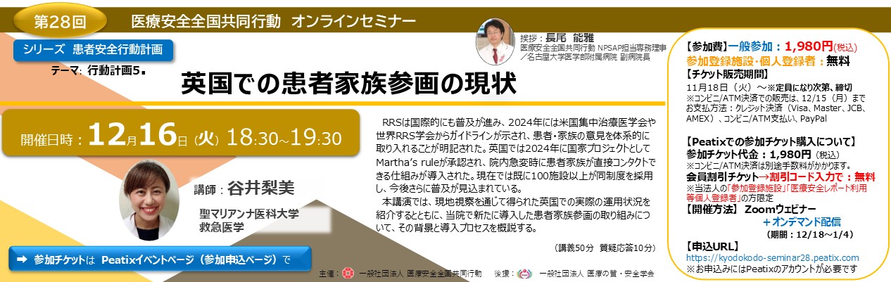 医療安全全国共同行動 第28回 オンラインセミナー ・ 開催日時 : 2025年12月16日(火) 18:30~19:30 開催形式 : オンラインライブ配信 (Zoomウェビナー) 主催 : 一般社団法人 医療安全全国 …